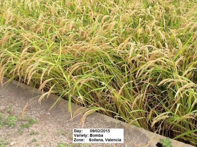 Plot of Bomba rice. The left plot is treated with ROOT RICE and EDYFRUIT ARROZ and the right plot is treated just with ROOT RICE. The present farmers confirm that the plots have healthy plants with large and heavy panicles. The plot treated with ROOT RICE and EDYFRUIT ARROZ has higher chlorophyll than the treated only with ROOT RICE.
