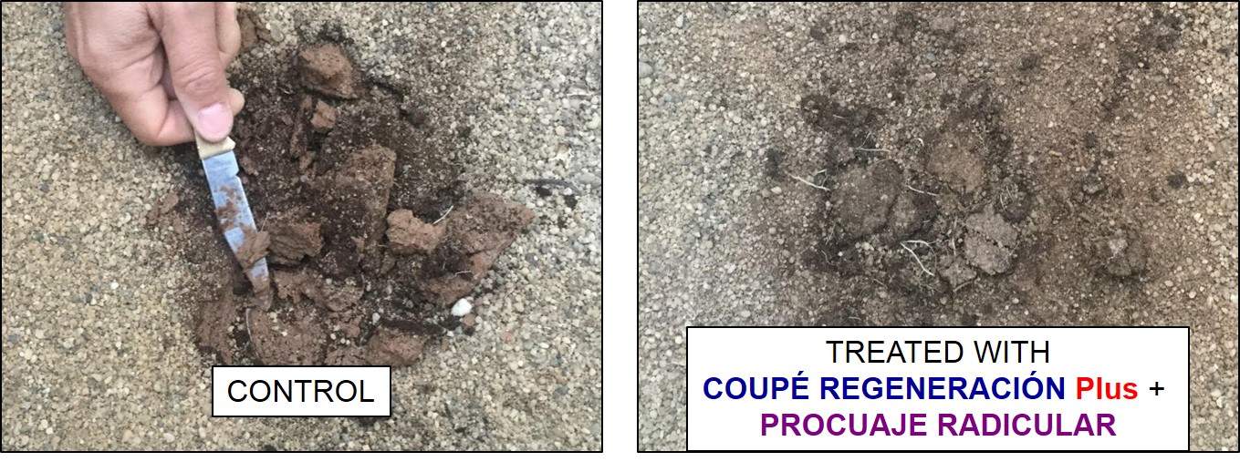 Soil samples to find the root have been made in the middle of the aisle between row and row, where no irrigation water comes but the root activated and promoted with the application of biotech products of EDYPRO reaches.