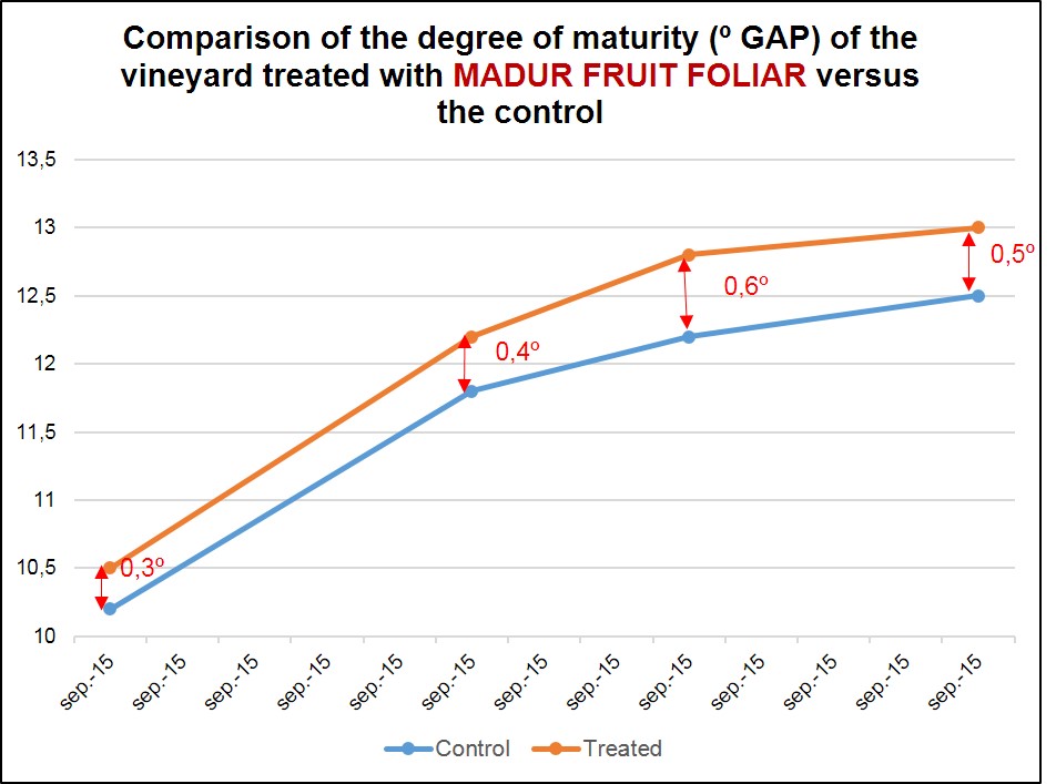 As observed in the statistical graph, the maturity level of the grapes treated with MADUR FRUIT FOLIAR increases rapidly and above the control vineyard.