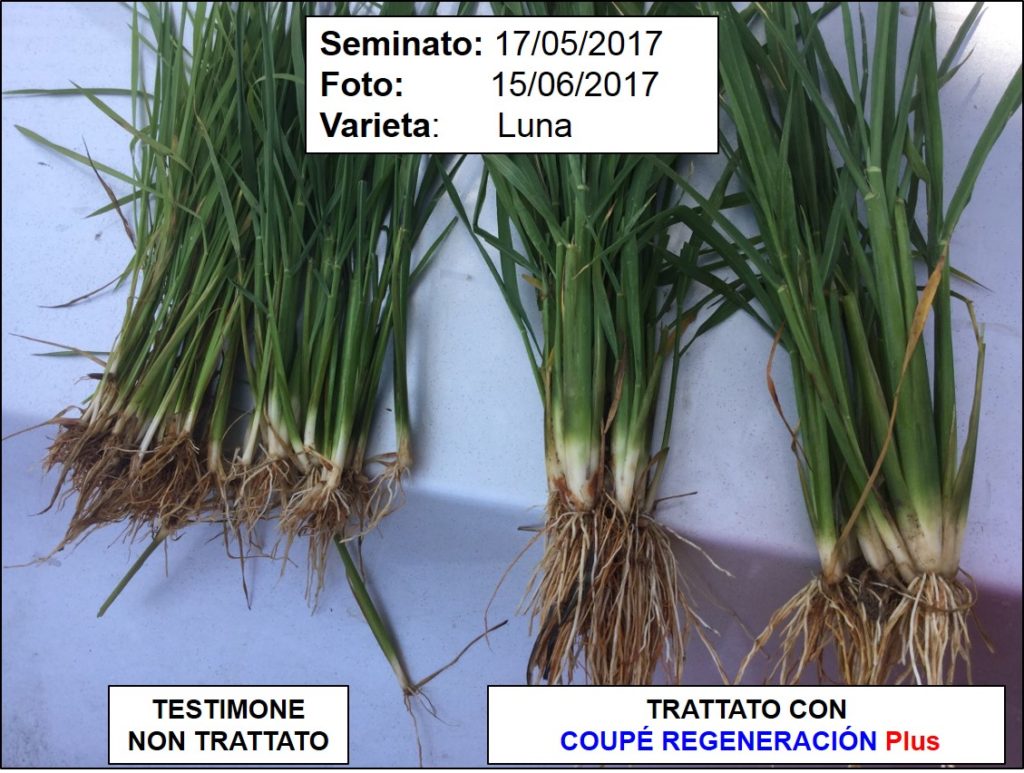 Ieri, il 15 giugno 2017, abbiamo visitato i campi del Portogallo per vedere i risultati della coltura del riso Luna dopo il trattamento con COUPÉ REGENERACIÓN Plus, un prodotto progettato per riattivare il terreno della coltura che agisce spostando i sali tossici del complesso argillo-umico ottenendo un terreno più attivo e con un grande sviluppo vegetativo.