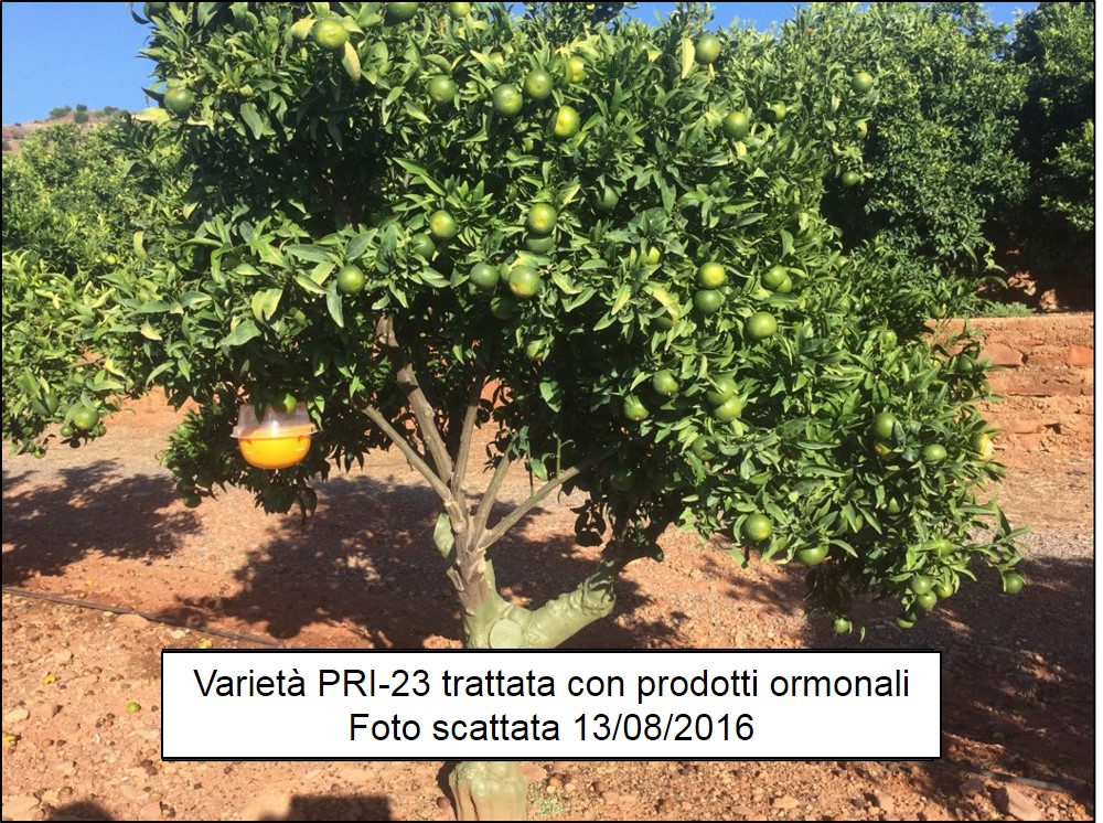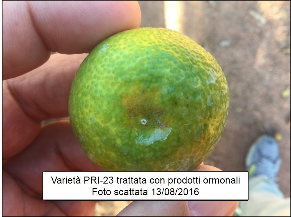 La varietà PRI-23 sta soffrendo molto e quando sono stati utilizzati prodotti ormonali per l’accrescimento, la varietà sta rapidamente entrando in un marcato cambiamento di colore e l’inizio della maturazione; momento in cui l’accrescimento del frutto cessa e rimane in una dimensione non commerciale. Inoltre il frutto, essendo trattato con ormoni, ha un asse centrale deviato e sta crescendo da una parte rispetto all’altra, cioè i frutti hanno una configurazione morfologica deformata.