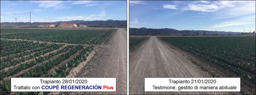 L’agricoltore ha applicato COUPÉ REGENERACIÓN PLUS a 60 L/ha su una parte della sua coltivazione (nella foto il lato sinistro della strada) il 12 febbraio e i risultati alla fine dello stesso mese erano molto evidenti: