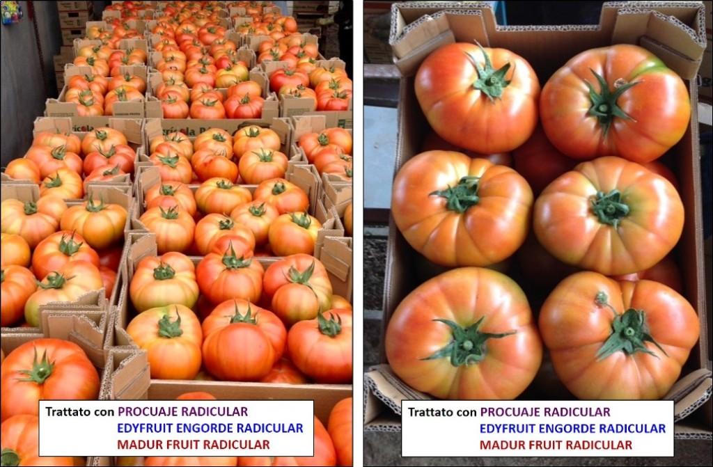 In questa varietà di pomodoro Bernal, le applicazioni di PROCUAJE RADICULAR sono state avviate dalla prima fioritura, alla dose di 15 L./ha. Successivamente, quando i frutti hanno raggiunto una dimensione di 2-3 cm, sono iniziate le applicazioni di EDYFRUIT ENGORDE RADICULAR alla dose di 15-20 L./ha. Le applicazioni di entrambi i prodotti sono state ripetute ogni 10-15 giorni.